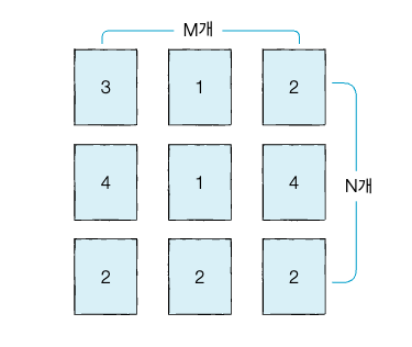 - 숫자가 쓰인 카드들이 N x M 형태로 놓여 있다. 이때 N은 행의 개수를 의미하며, M은 열의 개수를 의미한다.